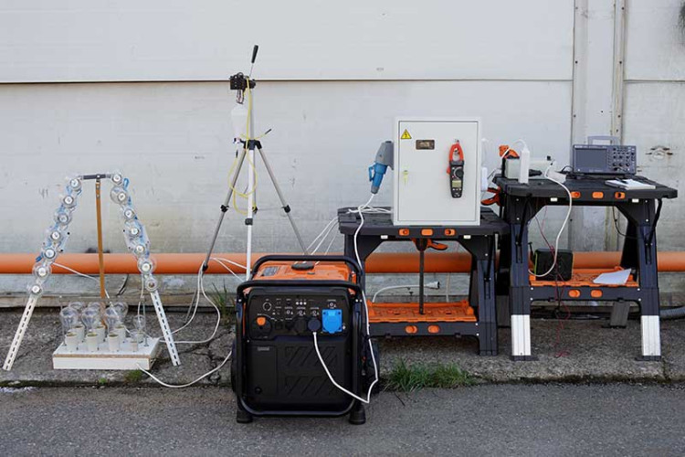 Для измерения мощностных характеристик мы сделали специальный стенд, на вход которого подключаем генератор, а на выходе установлены четыре розетки, к которым можно присоединять те или иные потребители энергии. Стенд позволяет включать или отключать каждую из розеток в произвольном порядке, указывает потребляемую мощность и ток. В качестве нагрузки мы используем стенды с набором ламп накаливания разной мощности, от 100 до 500 Вт. Суммарная потребляемая мощность одного такого стенда– до 3,5 кВт, для испытаний мощных электростанций мы одновременно задействуем два или даже три стенда.