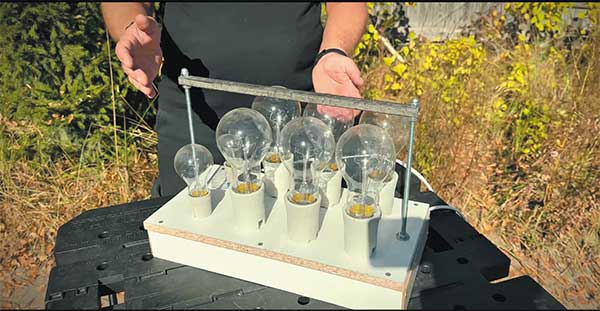 Для точного «дозирования» времени нагрузки мы сделали специальный таймер, который при нажатии кнопки «Пуск» замыкает силовые реле на установленное время – в нашем случае это ровно три секунды. Ранее мы пытались создавать высокий пусковой ток с помощью погружных насосов, но как выяснилось, обеспечить одинаковые для всех участников условия этим способом не получается. Поэтому пошли другим путём: нагрузку задаём обычными лампами накаливания, и с помощью таймера ограничиваем время их работы.