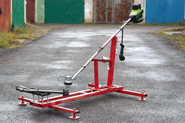 Также важно отметить вот что. На период экспериментов и наладки стенда мы использовали для максимальной достоверности условий мощный бензиновый триммер с мотором в 42 «кубика» – именно с ним и был определен испытательный предел. Но работать с бензокосой в закрытом помещении невозможно, и мы после всех испытаний сменили ее на сверхмощный профессиональный аккумуляторный триммер Greenworks GD80BCB с 82-вольтовой батареей. Проведенная повторная проверка на дублирующих экземплярах различных тестовых дисков, ранее прошедших через бензиновый вариант стенда, показала, что аккумуляторный привод работает точно так же, как и бензиновый предшественник. На нем и остановились в итоге.