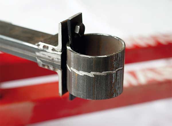 Чтобы провести объективный и системный тест дисков с твердосплавными напайками, мы, как уже говорилось, создали специальный стенд. Он имитирует ударно-скользящее касание диском остатков металлического заборного столбика – типичного препятствия, которое может встретиться в густом бурьяне или подлеске.