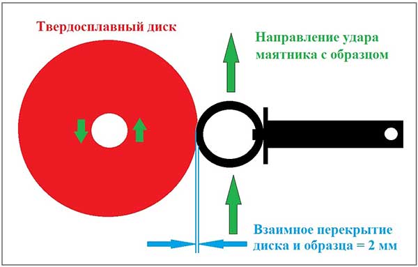Высокая продолжительность и трудоемкость теста с участием большого количества дисков объяснялась в том числе необходимостью после каждого удара менять на образце столбика рабочий сектор. Поскольку в процессе удара диск, вращающийся с высокой скоростью, успевает пройти по образцу несколькими зубами и пропилить в нем паз, в каждом последующем цикле трубу приходилось проворачивать в своем фиксаторе на угол около 15 градусов, что давало возможность делать на одном образце множество ударов.