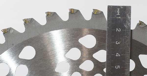 Тем не менее, в тяжелых условиях работы очень легко не заметить в густых зарослях разного рода инородные тела – остатки заборных столбиков, торчащую арматуру и иной «чермет», «дикие» булыжники и «культурные» кирпичи, бутылки и банки. На скорости 8–10 тысяч оборотов в минуту даже легкие касания таких объектов – очень тяжелое испытание для мелких зубцов диска. Твердосплавные элементы могут откалываться целиком или частично, вызывая снижение режущей способности диска, порождая дисбаланс, да и просто риск попадания куда не следует.