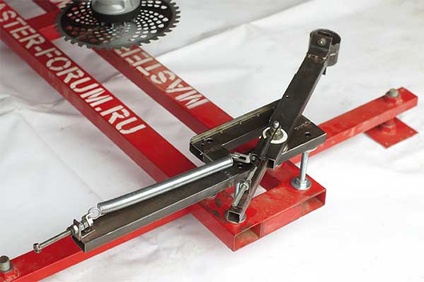 Для имитации такого удара мы расположили на стенде жестко установленную мотокосу под рабочим углом – собственно, так, как ее держит в руках косарь; с диском в плоскости, параллельной земле (хотя это не принципиально, просто для удобства и наглядности). Рядом с диском на раме стенда смонтировали ударный маятник, приводимый в движение пружиной. На подвижном рычаге маятника закрепили отрезок круглой трубы диаметром 60 мм, имитирующей заборный столбик. Маятник взводился, пружина натягивалась, после чего удерживающая чека освобождала маятник и его рычаг с отрезком трубы бил в горизонтальной плоскости по вращающемуся с рабочей скоростью диску.